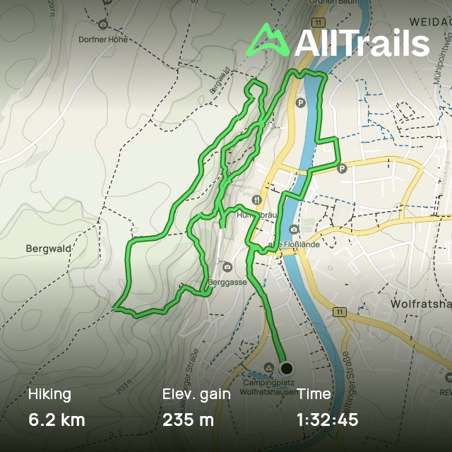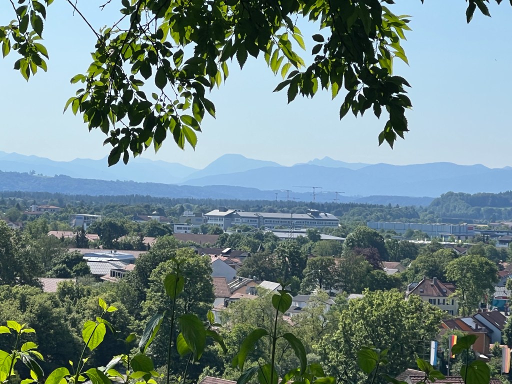 Vi tog en morgonrunda med K på berget ovanför Wolfratshausen. En naturstig med utbildningsplatser, informationstavlor och aktiviteter för barn, så nu har vi på knagglig skoltyska läst information om diverse fåglar, träd och insekter. Vacker utsikt över samhället med alptoppar i bakgrunden.