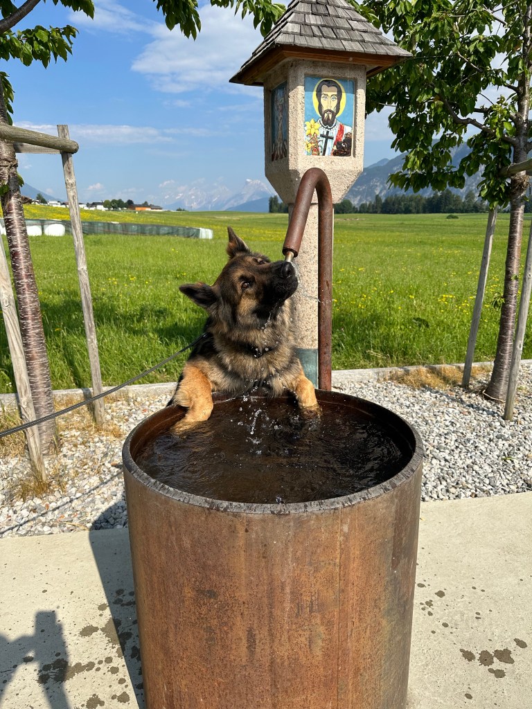 Vi tog en promenad till Götzens för att handla mat. På vägen dit passerade vi en av alla otaliga små fontäner med rinnande vatten, bilder på en plågad Jesus och massor av blommor. Eftersom det var så varmt kunde K inte stå emot att dricka sig otörstig – men han är väl också en av Guds skapelser…