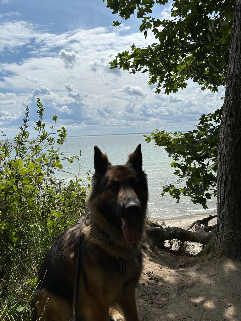 Imorse gick vi en skön 7-km-runda som sträckte sig genom åkrar och ängar, i skog och längs kusten. En del av sträckan visade sig gå rätt igenom någon sorts semesteranläggning med hästar – ett stort område med stallar, hagar och bostadshus, där det stod stora skyltar om att hundar var förbjudna. Vi hittade ingen annan väg igenom, så vi fick köra ”oj, vi förstår ingen tyska alls. Ursäkta, vi måste ha gått vilse”-kortet när en anställd kom i kapp oss för att på ett artigt sätt be oss dra åt helvete.