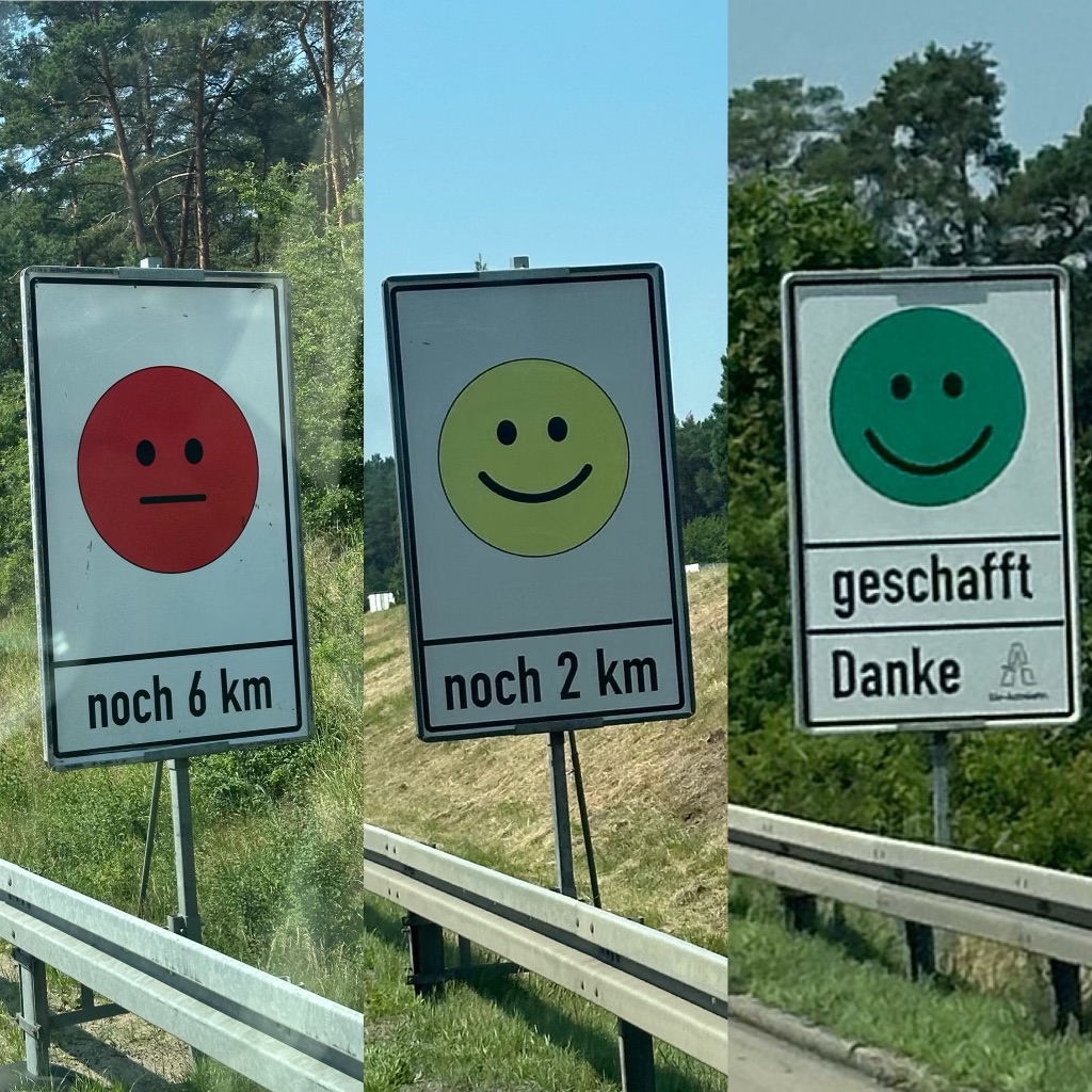 Vid tyska vägbyggen finns extremt pedagogiska skyltar över hur långt det ska pågå. Varannan kilometer sitter först arga, sedan sura, sedan neutrala och till sist glada smileys så att man verkligen inte ska tappa modet och börja svära över eländet.