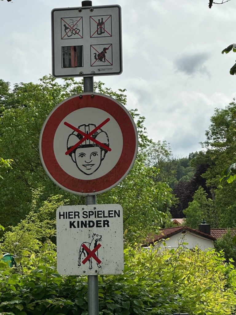 Bredvid campingen finns en förskola. Här finns en skylt vi fortfarande klurar på. ”Här leker barn”, men vad betyder förbudsgubben? Inga byggarbetare? Inga hjälmar? Inga män? Förbud mot cykelhjälm?