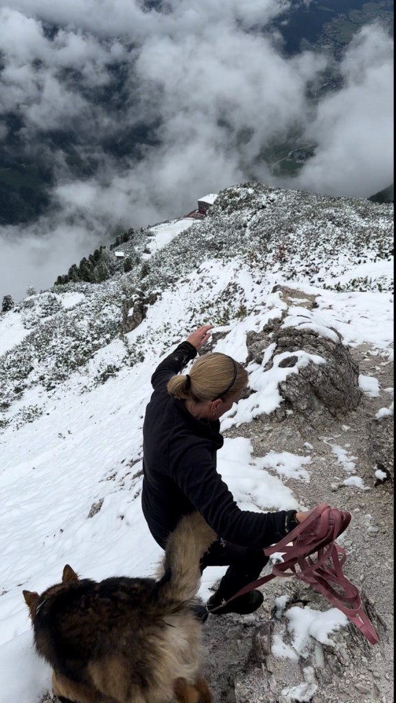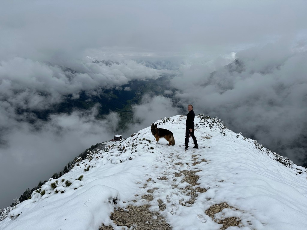 Imorse slutade äntligen regnet, så vi tog liften upp. Vi var såklart först ut, så dimman låg tät. Väl uppe ser vi lite vitt ludd på marken.