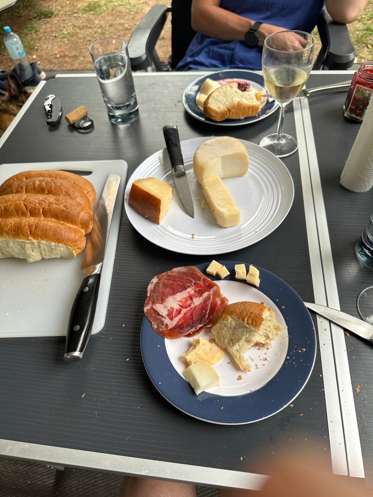Nu äter vi magiskt goda lokala ostar – getost, rökt ost och någon svåruttalad krämig historia. P får torkat griskött till (typ bresaola fast gris), med lokalt nybakat bondbröd. Supergott. Men vi kan erkänna att en näve svenska solmogna jordgubbar så här på midsommar hade suttit fint!